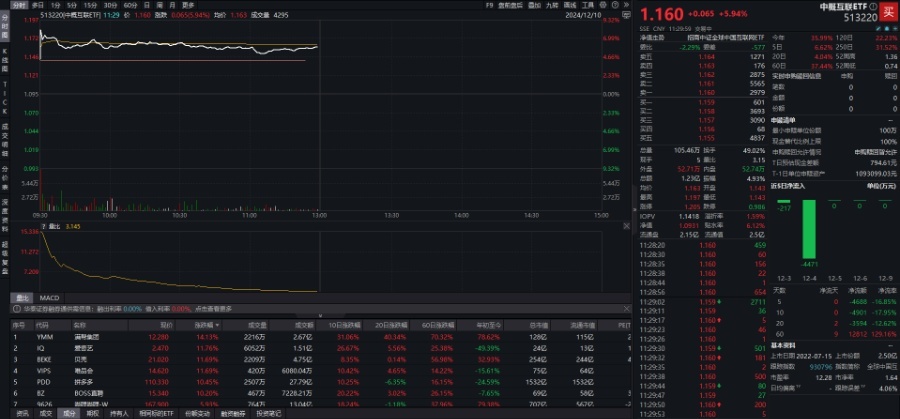 相关ETF方面,中概互联ETF(513220)早盘上涨5.94%,成交额超1.2亿元,换手率高达49.02%,盘中交投活跃,溢折率1.59%。